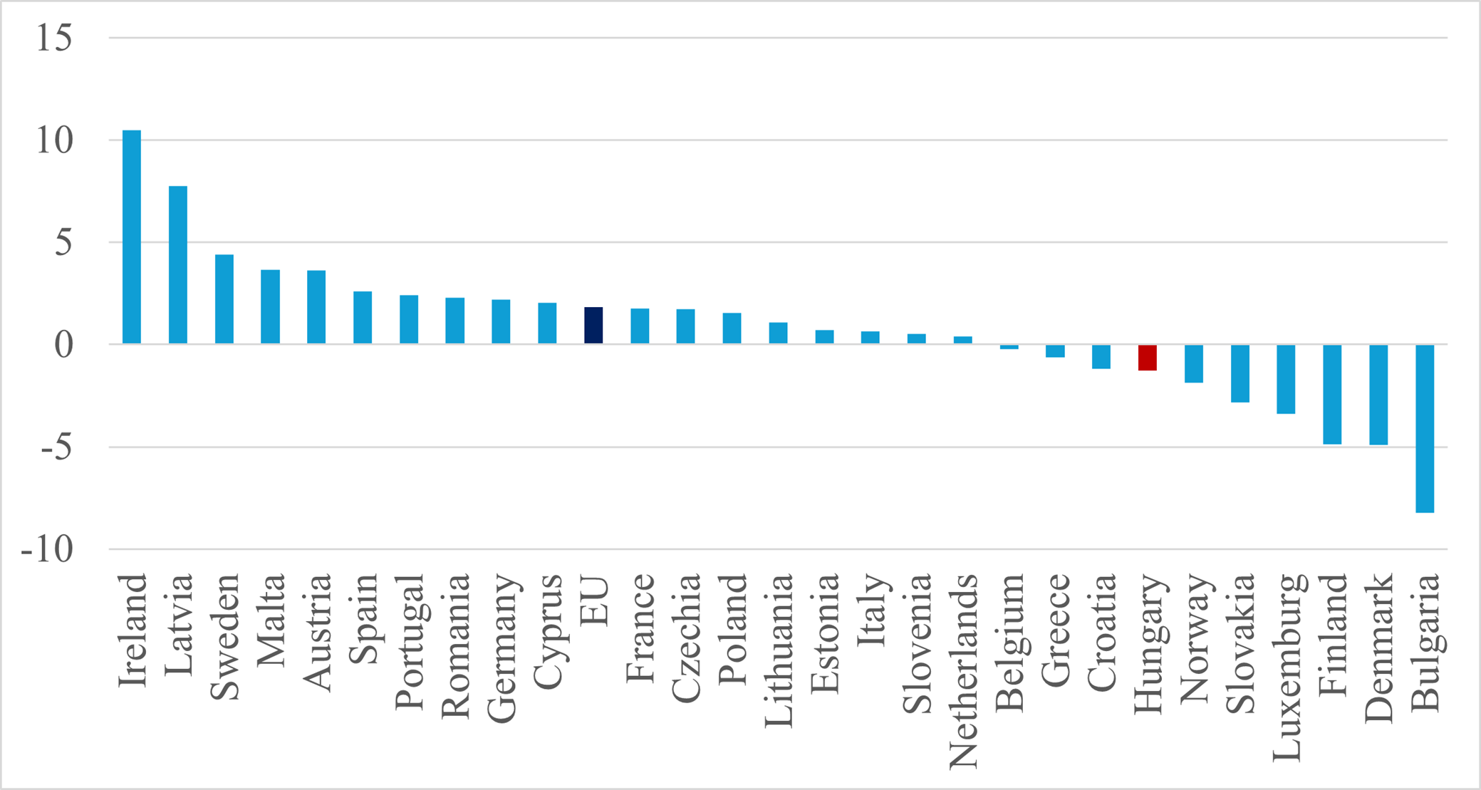 In July 2025, industrial output in the EU rose 1.8% compared with the same month in 2024. Germany’s industry, which only returned to growth in May, expanded by 2.2% year on year in July – a welcome sign for Hungarian manufacturers, given that they share some of the same markets and supply many German factories. In contrast, Hungary’s industrial production fell by 1.3% in July, the 7th largest decline in the EU.