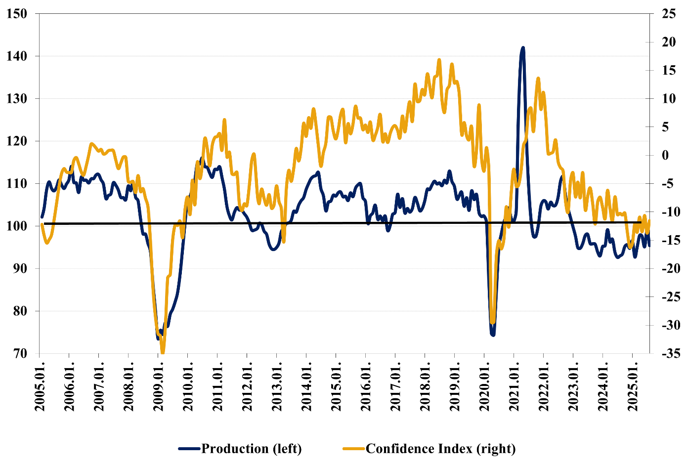 Signs of recovery are emerging in Hungary’s key markets, and prospects have improved following the US–EU tariff agreement. The rebound has begun, but progress is slow. It appears that without growth in the wider EU economy, Hungarian industry cannot return to an upward trajectory: around two-thirds of sales are exported, while domestic demand, even with artificial stimulus, is insufficient to offset weak foreign demand. New plants coming online later in the year may inject some momentum, helping to temper the decline seen in the first half. Yet based on gross production data and business confidence indicators, industrial output is unlikely to rise over the course of 2025. By the end of the year, the downturn may stabilise, and sustained growth could begin in 2026, supported by improving export prospects.