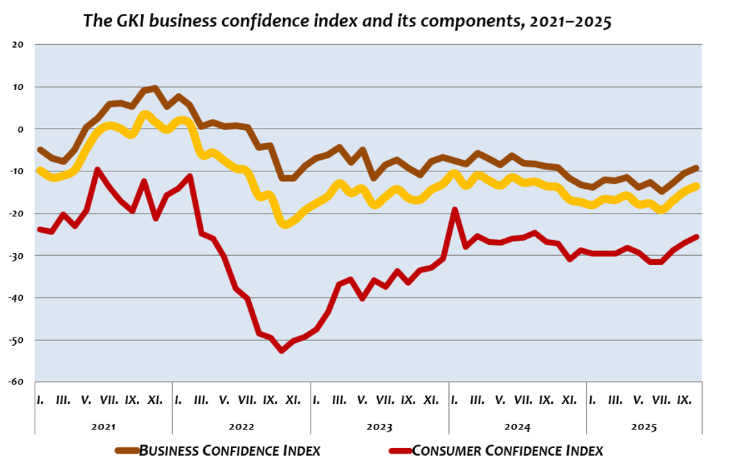 GKI Economic Research Co. – in accordance with the methodology of the European Commission – takes into account the expectations of the business sector and the population (i.e., consumers) when calculating its economic sentiment index: the index is the weighted average of the Consumer Confidence Index and the Business Confidence Index.
