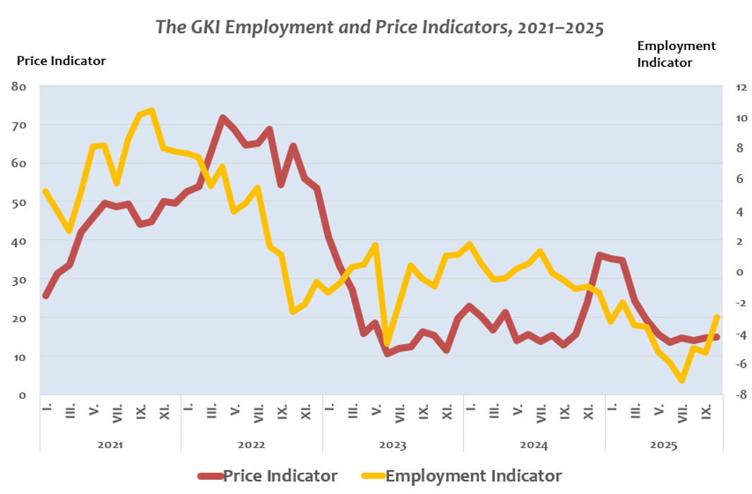 The GKI Business Confidence Index is the weighted average of the industrial, trade, construction, and service confidence indices. The employment indicator reflects the difference between the proportion of companies planning to increase and those planning to reduce their workforce over the next three months. The price indicator reflects the difference between the proportion of companies planning to raise and those planning to lower sales prices over the next three months.