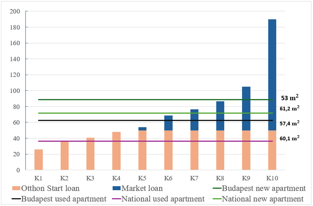 The fifth income decile (K5) is already in a more comfortable position, and with the Otthon Start Program’s maximum limit of HUF 50 million, they can also take a market-rate loan, bringing the total maximum loan amount to HUF 54 million. This allows them to find a used apartment even in Budapest with a sufficient down payment. For the sixth and seventh income deciles (K6, K7), the loan amounts they can take (HUF 69 and 77 million) are already sufficient to afford a newly built apartment in the countryside.