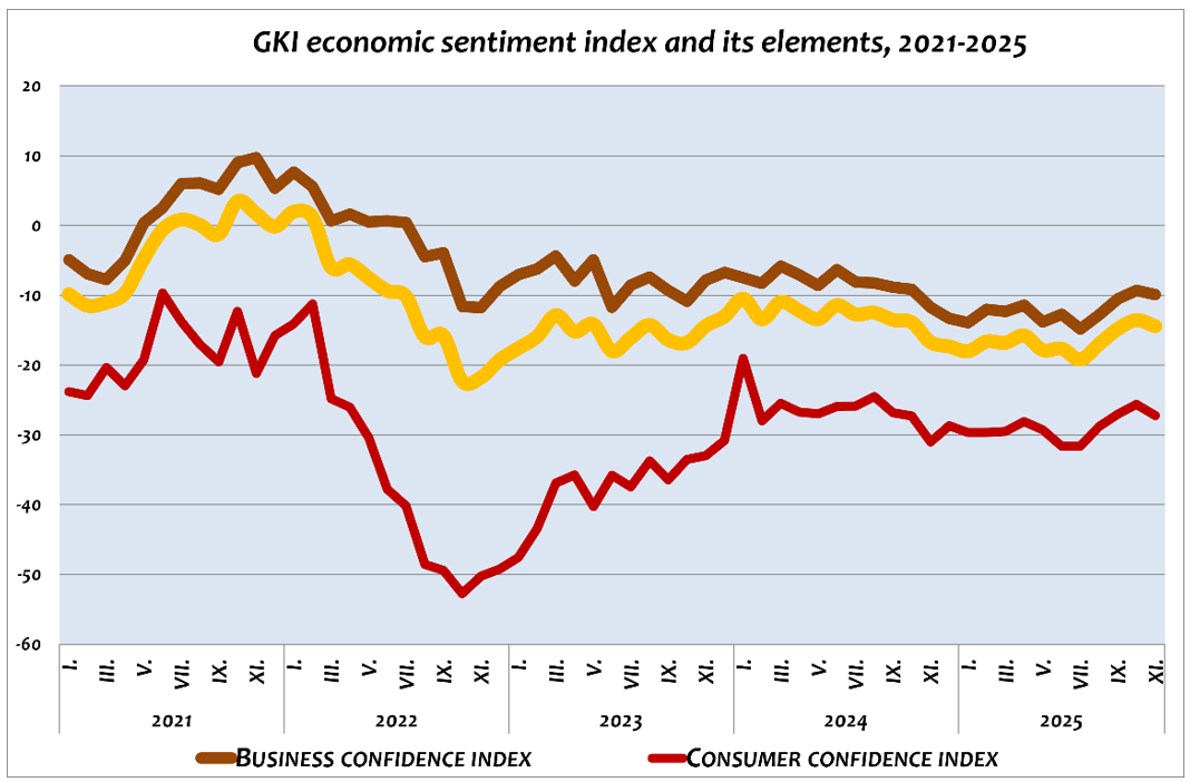 GKI Economic Research Co., following the methodology prescribed by the European Commission, calculates its economic sentiment index by integrating expectations from both the business sector and households (consumers). Specifically, the GKI economic sentiment index is a weighted average of the consumer confidence index and the business confidence index.