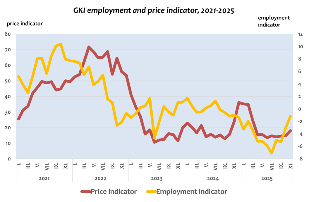 The GKI business confidence index itself is a weighted average of confidence indicators from four sectors: industry, retail trade, construction, and services. The employment indicator reflects the net balance of firms planning to increase or decrease their workforce over the next three months. Similarly, the price indicator measures the net difference between companies intending to raise or lower their selling prices within the same period.