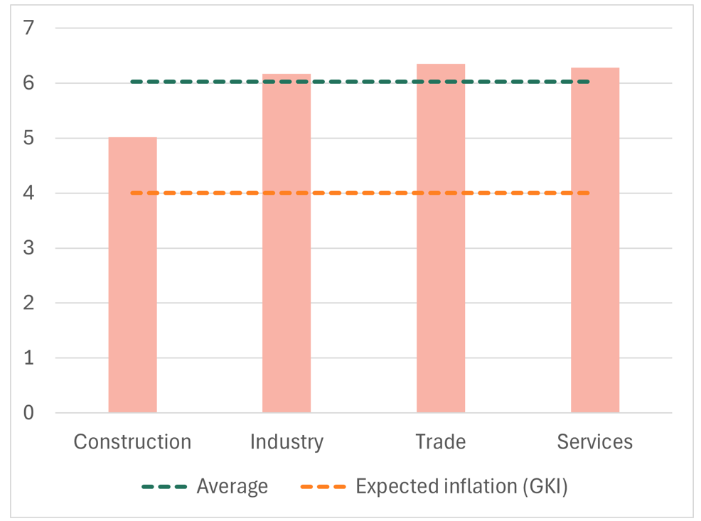 Construction firms again plan more modest increases this year, of around 5%. By contrast, employers in industry, trade and services are anticipating average rises slightly above 6%.