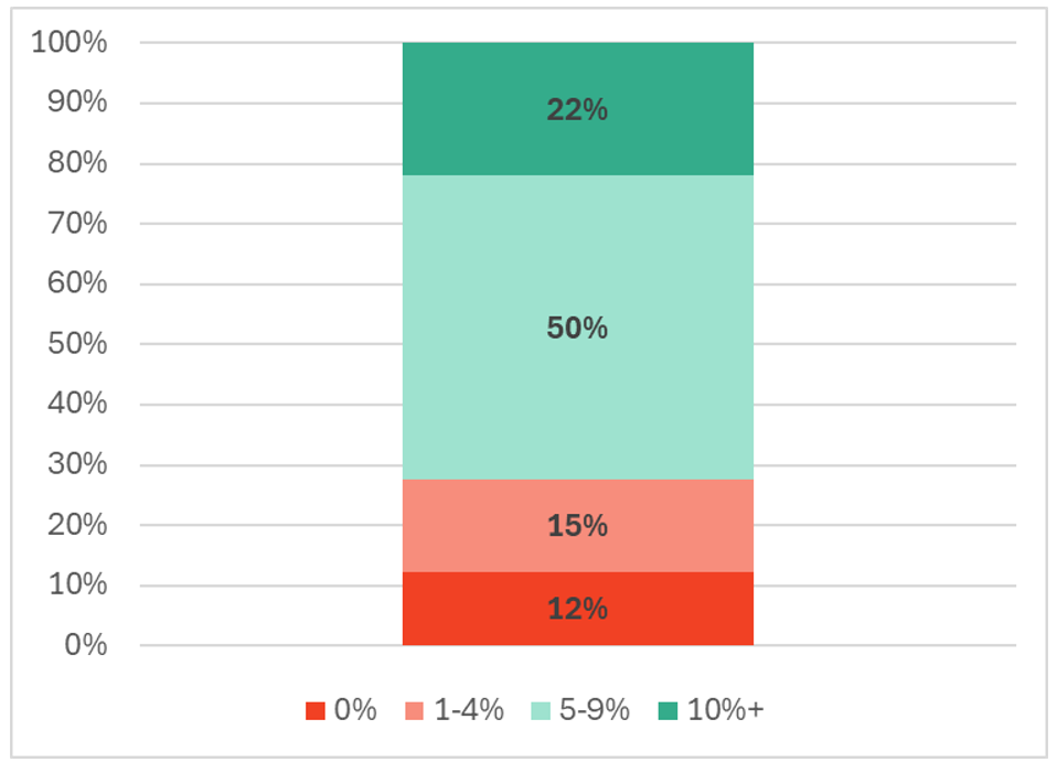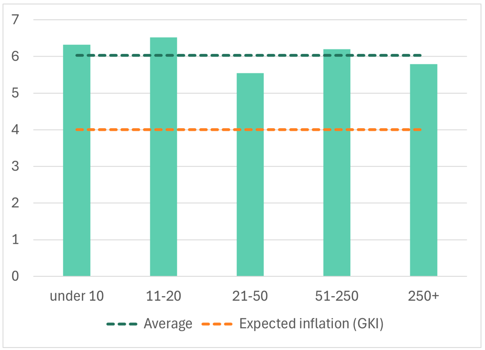 Twelve per cent of the surveyed firms do not plan any wage increase at all, while a further 15% expect rises of less than 5%. Half of the companies plan increases of 5–9%, and 22% are budgeting for 10% or more.