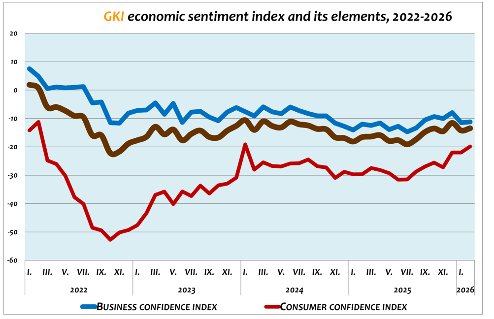 According to a survey by GKI Economic Research Ltd. – conducted with the support of the EU – consumers’ prospects improved noticeably in February, while those of companies remained practically unchanged compared to January. The summary indicator of the prospects, the GKI business climate index, rose by 1 point. The willingness of companies to employ weakened slightly, and the overall expectation regarding the expected development of sales prices decreased slightly. The responding companies felt that the business environment was somewhat more unpredictable in the second month of this year than in January.