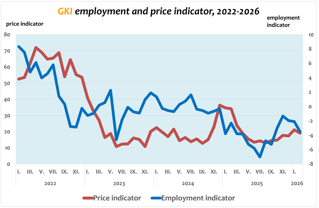The employment indicator, which indicates the aggregated staffing expectations of businesses, decreased slightly in the second month of 2026 compared to January. This indicator has fallen to a five-month low. In the next three months, 10% of businesses are preparing to increase their staff, while 11% would reduce it. In the construction industry and trade, those seeking to reduce their staff are in the majority compared to those planning to expand.