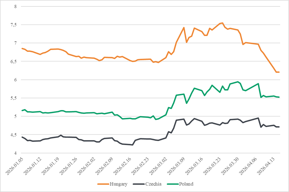 10-Year Government Bond Yields: Hungary, Poland, and Czech Republic (Percentage, Jan 2026 – April 2026)