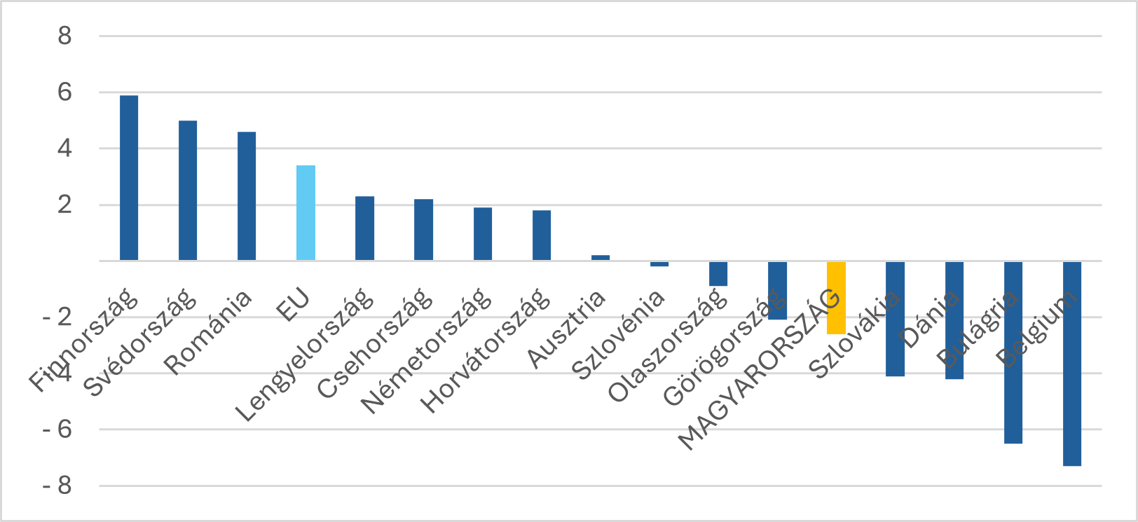 Az ipari termelés változása néhány EU-s országban 2025. májusában 2024. májusához képest (%)