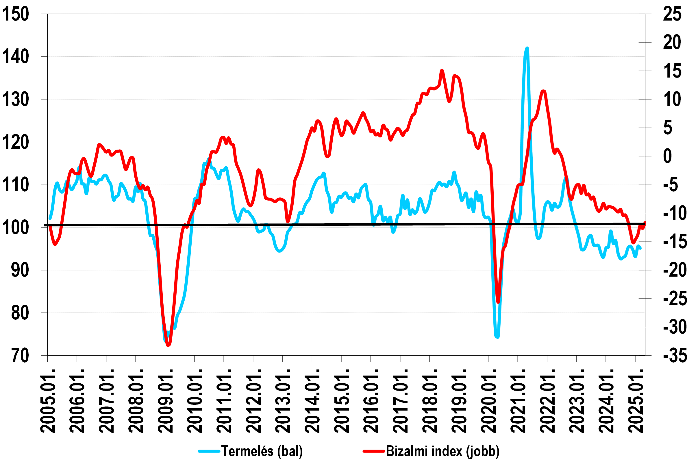 2025 első öt hónapjában az ipari termelés volumene 4,1%-kal elmaradt az előző év azonos időszakától, míg az összes értékesítés 64%-át adó külpiaci eladások volumene 0,6, a 36%-ot képviselő hazai értékesítésé 4,0%-kal mérséklődött ugyanezen időszakban.[2] A legnagyobb (19,5%-os) romlás a villamosgépgyártás alágban történt, ahová az akkumulátorgyártás is tartozik. De több, mint 10%-ot esett a fémipar teljesítménye is. A feldolgozóiparon belül nagy súlyú járműgyártás termelése is csökkent idén május végéig 2%-kal. A magyarországi autógyárakból műszakszám csökkenésekről, leépítésekről jönnek hírek, továbbá az épülő nagy gyárak termelésbe lépésének várt dinamizáló hatás idén még gyenge lesz. A legtöbb feldolgozóipari alágban csökkent a termelés az első öt hónapban. Az elektronikai ipar 6,7%-os növekedése sokat javított az összesített teljesítményen, de emellett nőtt még a termelés a fa-papír- és nyomdaiparban (3,9%) is.