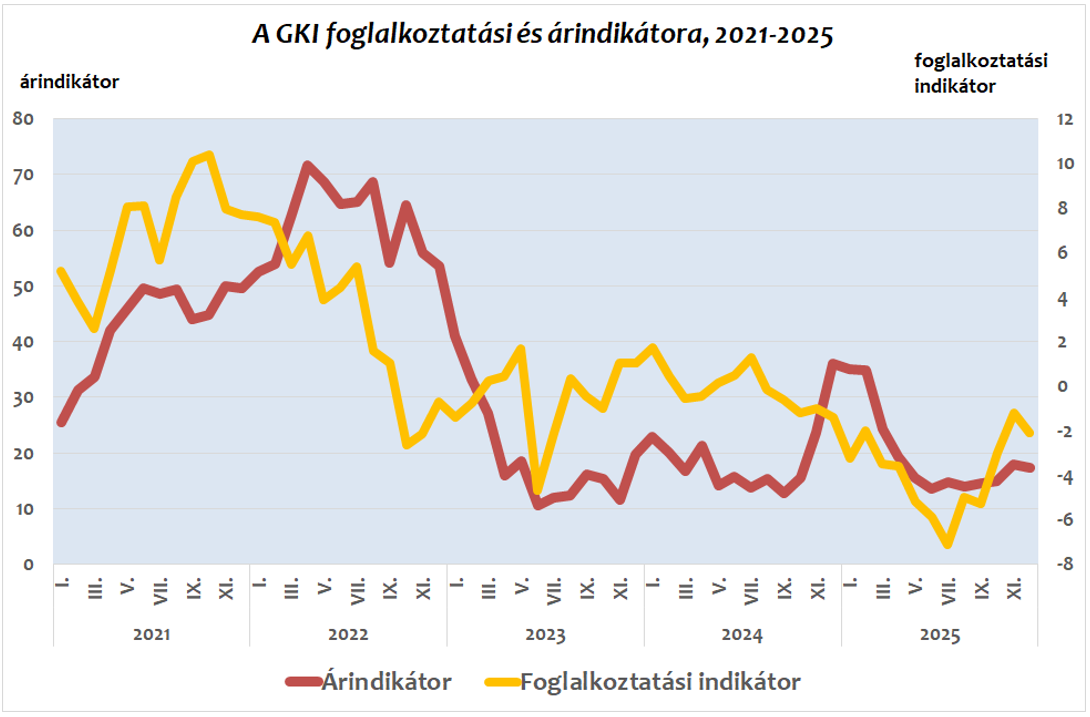 Az ár-indikátor, ami a cégek értékesítési árainak a következő három hónapban várható alakulását mutatja, három havi stagnálás után, novemberben némileg emelkedett a megelőző felméréshez képest, majd e mutató decemberben alig változott. A következő három hónapban a cégek 29%-a szeretne árat emelni, míg árcsökkentésre 9%-a készül.