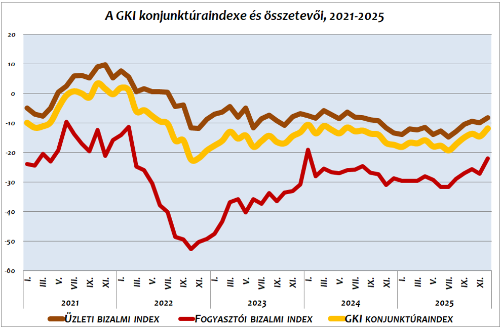 A GKI üzleti bizalmi indexe – a novemberi döccenő után – decemberben 2 ponttal emelkedett az előző hónaphoz képest. Ez is tizennyolc havi csúcsot jelent. Ebben a hónapban az ipari bizalmi index számottevően, csaknem 4 ponttal növekedett, miközben a kereskedelmi és a szolgáltatói index gyakorlatilag nem változott, az építőipari mutató pedig csaknem 4 ponttal csökkent. Az ipari index utoljára huszonegy hónapja volt ilyen magas. A közeljövő kilátásait illetően továbbra is az építőipar a legkevésbé, az üzleti szolgáltatások pedig a leginkább derűlátó szektor.