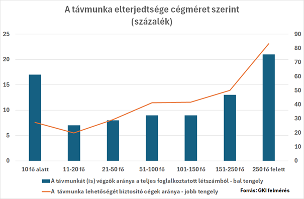 A GKI felmérése szerint a cégek 27%-a biztosítja az otthoni munkavégzés lehetőségét legalább dolgozói egy részének. A home office tehát Magyarországon stabil, de erősen szegmentált foglalkoztatási formává vált. Az otthoni munkavégzés elterjedtsége kiemelkedő a szolgáltató szektorban és szinte egyáltalán nem jellemző az építőiparra. Leginkább a nagyvállalatok élnek szívesen ezzel a foglalkoztatási formával, 83 százalékuk alkalmazza a távmunkát. A következő egy-két évben a vállalkozások háromnegyede nem szándékozik változtatni ezzel kapcsolatos gyakorlatán.