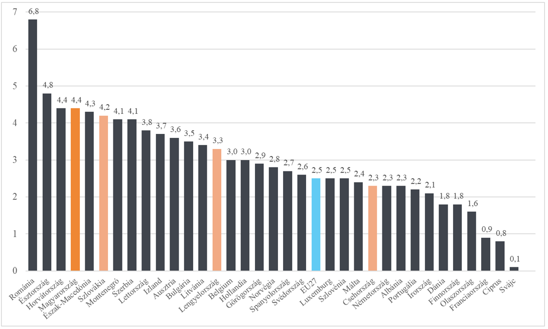 A visegrádi országok között Magyarországon volt a legmagasabb a pénzromlás üteme, amelyet szorosan követ a hasonló makrogazdasági kihívásokkal küzdő Szlovákia, míg Lengyelország az európai mezőny közepén helyezkedik el. Csehország az egyetlen olyan szereplő a négyesből, amelynek sikerült az uniós átlag alá szorítania az inflációját. A 2025-ben az euróövezet inflációs rátája 2,1% volt, 2026-ra 1,9%-ot prognosztizál az Európai Központi Bank. Mindez azt jelenti, hogy az eurózóna átlagos adatai megfelelnek az EKB inflációs célkitűzésének, bár számos kelet-európai tagállamban, így a már említett Szlovákia és Horvátország mellett a balti országokban is a 2%-os célnál jóval magasabb az infláció.