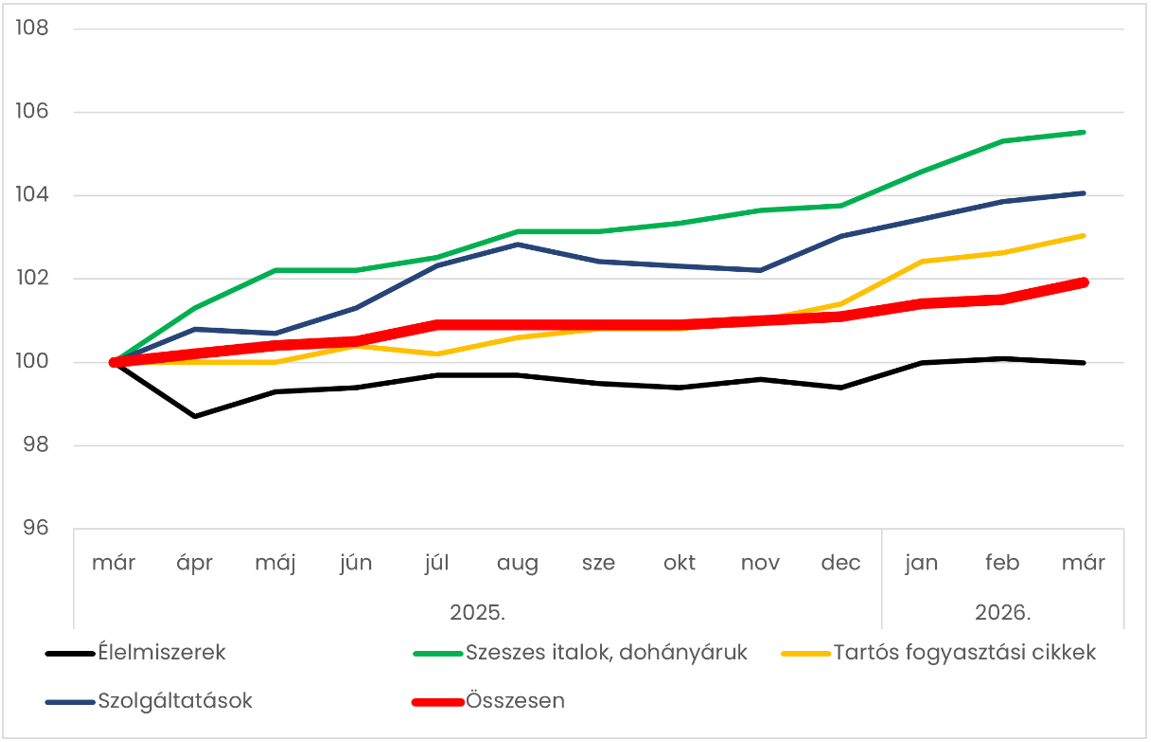 Az élelmiszerárak stagnálása, és azon belül a feldolgozott és feldolgozatlan élelmiszerek árának csökkenése rámutat, hogy az árrésstop és a forint éves összevetésben történt erősödése is fékezte az áremelkedést. A szeszes italoknál és a dohányáruknál az adók emelése okozta az átlagon felüli drágulást. A ruházkodási cikkek az elmúlt egy évben nagy volatilitást mutattak (erre a szegmensre egyébként is jellemző a szezonalitás), azonban összességében lassabb volt az áremelkedés üteme, mint a teljes árindexé. A szolgáltatások és a tartós fogyasztási cikkek ezzel szemben éves szinten 4,1 és 2,7 százalékkal növekedtek. Az utóbbiak esetében a forint hosszabb távú erősödése mérsékelte, míg a hazai vállalkozások költségeinek emelkedése és az árrésstopból fakadó esetleges keresztárazás növelte az árakat.